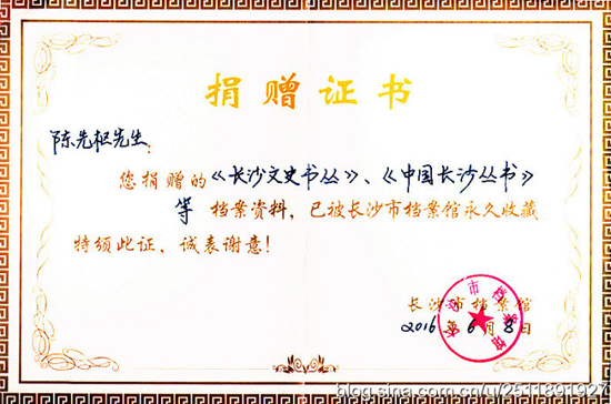(通讯员 陈荣飞)国际档案日之际,陈先枢将自己从1982年至2016年34年间编著和参与编著的图书共136部捐赠长沙市档案馆。捐赠仪式上,长沙市档案局谭利平局长为陈先枢馆员颁发证书并致词感谢。