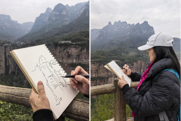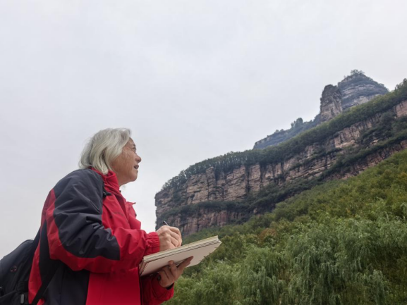 馆员和特约研究员们深入河南太行山腹地,穿梭于山岭、峡谷、遗迹之间,他们纷纷拿起手中的画笔、相机和笔记本,以绘画、摄影、笔记等多种方式记录下自己的所见所闻。不少书画家还当场拿出速写本,在山间、在水畔、在村口,迅速勾勒出祖国大好河山的壮丽风光和历史遗迹的沧桑风貌。每个人都沉浸在太行山得天独厚的自然与文化资源中,直观感受着太行山独特的地质风貌、深厚的文化底蕴以及伟大的红色精神。
