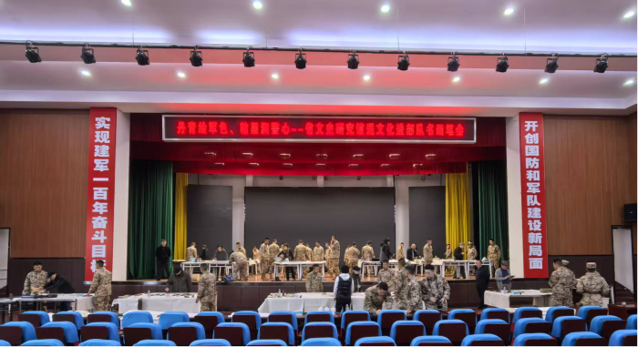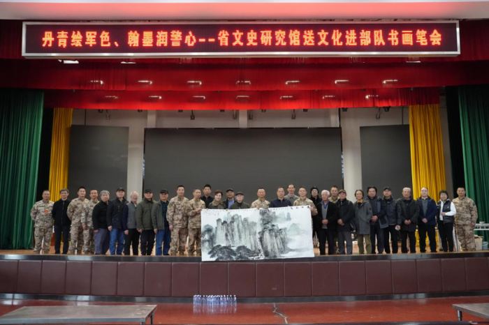 为深入学习贯彻习近平文化思想,厚植中华优秀传统文化根脉,以文化赋能军营建设,丰富武警官兵精神文化生活,厚植军民鱼水深情,12月5日上午,省文史研究馆副馆长何文斌带领馆员、特约研究员书画家一行20余人,走进武警湖南总队新兵团举办“丹青绘军色、翰墨润警心”——省文史研究馆送文化进部队书画笔会活动,为部队官兵送上一份浸润墨香的文化厚礼。周中耀、周克臣、康移风、王炳炎、欧阳慧龄、陈和西、孔凡智、周群艺、张志、罗光磊等馆员,王千悦、欧程远、肖剑、廖连兴、袁绍明等特约研究员参加此次活动。