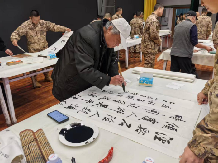 此次活动是省文史研究馆深入落实党的二十届四中全会精神,践行“文化惠民、服务基层”理念的具体行动。活动以书画艺术为纽带,不仅有效丰富了基层武警官兵的精神文化生活,让大家在紧张的训练执勤之余感受传统文化熏陶,更搭建起军地文化交流的坚实桥梁,进一步增进了军民情感共鸣。笔会临近尾声,书画家们将所有精心创作的作品郑重赠予部队。这些承载着敬意与祝福的作品,将被悬挂在部队活动室、会议室等场所,成为装点军营文化空间、激励官兵奋勇前行的精神风景,为推动军地文化共建共融、助力强军事业发展注入鲜活的文化力量。