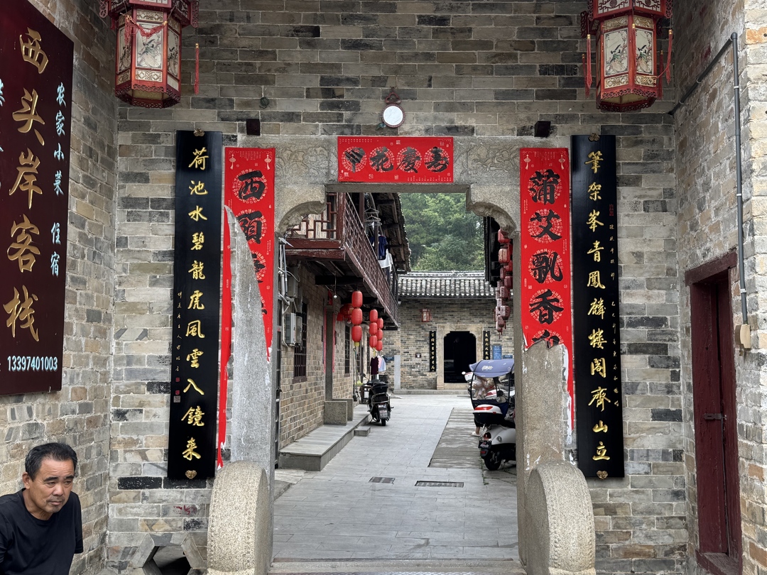 联意解析:上联讲述了张谷英村西头岸大门朝向正对青翠的笔架山,大院内楼台亭阁雕刻着精美的凤凰麒麟,这里孕育杰出人才,其高大形象可与笔架山比肩;下联则说的是大屋龙形山与正南数亩荷池一脉相连,池中巨石恰似龙珠,周边虎形山、狮形山与蓝天白云,倒映在清澈的池水之中,风动云影,美不胜收。龙虎风云入镜来是比喻英雄豪杰际遇得时,肝胆相照,光明磊落,砥砺前行。