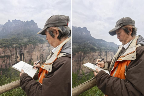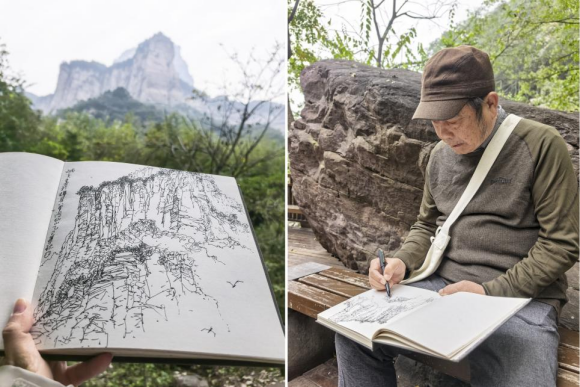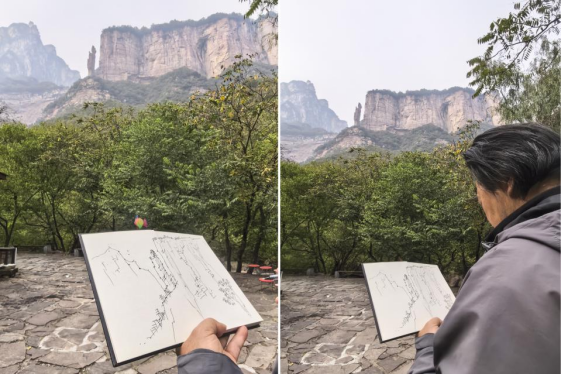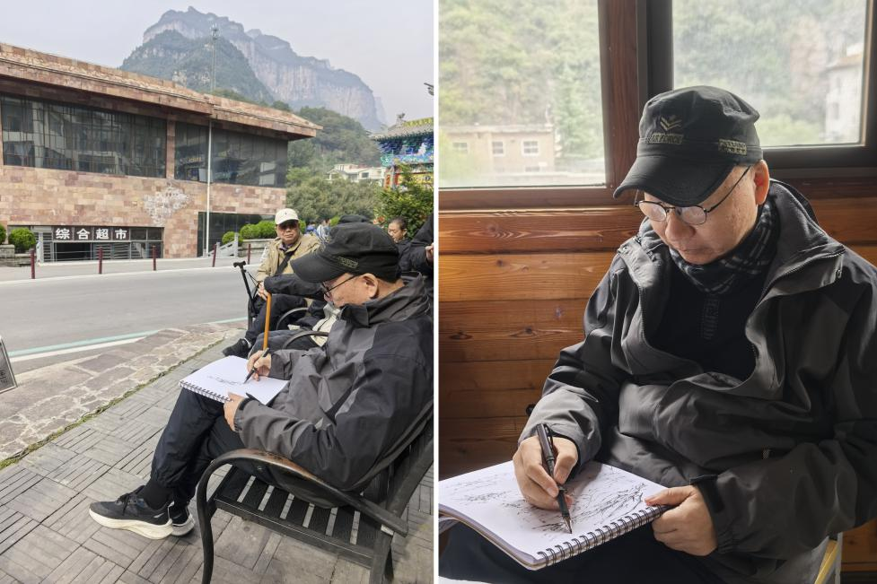 馆员和特约研究员们深入河南太行山腹地,穿梭于山岭、峡谷、遗迹之间,他们纷纷拿起手中的画笔、相机和笔记本,以绘画、摄影、笔记等多种方式记录下自己的所见所闻。不少书画家还当场拿出速写本,在山间、在水畔、在村口,迅速勾勒出祖国大好河山的壮丽风光和历史遗迹的沧桑风貌。每个人都沉浸在太行山得天独厚的自然与文化资源中,直观感受着太行山独特的地质风貌、深厚的文化底蕴以及伟大的红色精神。