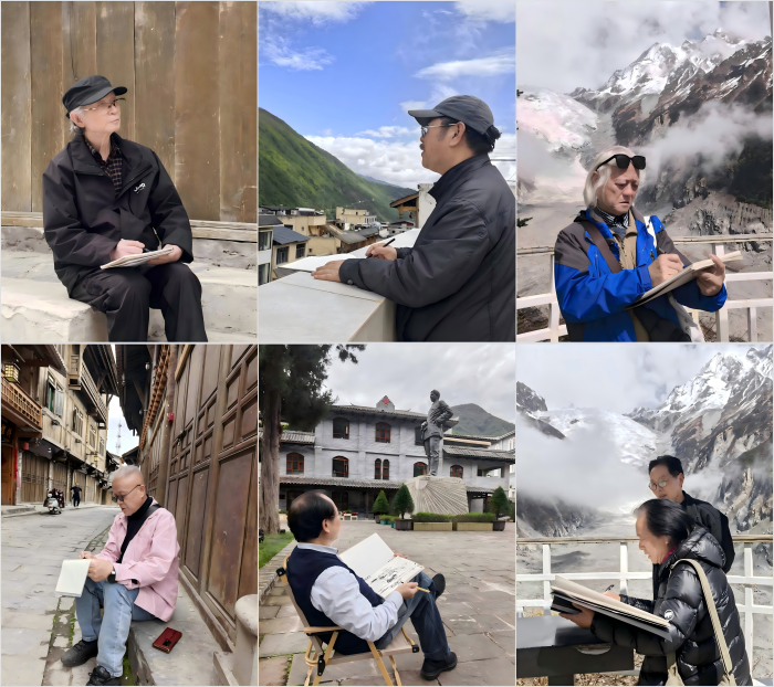 本次采风前,省文史研究馆提前对参与活动的馆员、特约研究员按专长进行了创作任务分工:一类聚焦长征历史事件重现,以人物画艺术再现飞夺泸定桥、强渡大渡河、翻越夹金山等关键场景,实现“画叙征程”;一类主攻山水写生,描绘夹金山、大渡河、川西高原的壮丽风光,实现“笔绘山河”;一类专注原创长征主题诗词与书法创作,以实地见闻感悟为核心抒写长征精神,实现“诗咏精神”,形成三位一体的完整创作体系。采风期间,大家一路踏访红色旧址、一路领会革命精神、一路开展写生创作,在雪山之巅、大渡河畔、红色旧址前,或凝神写生、或驻足沉思、或交流感悟,将长征壮举、红色遗址、川西雄奇山水与时代精神熔铸于笔端。